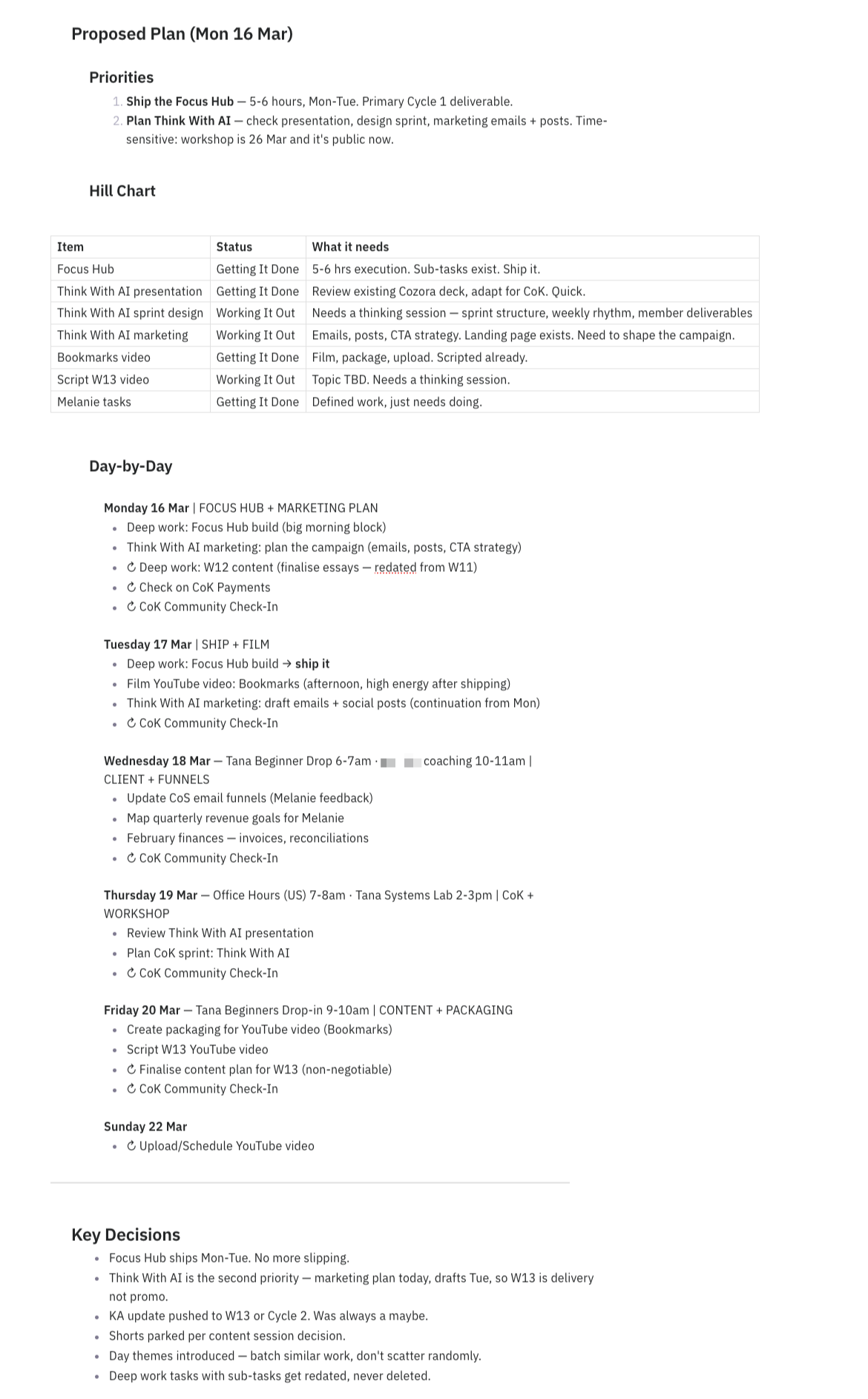 This skill gets me in alignment for the week, and it’s everything I always wanted a weekly planning workflow to be. The difference is I’m not responsible for most of it.
