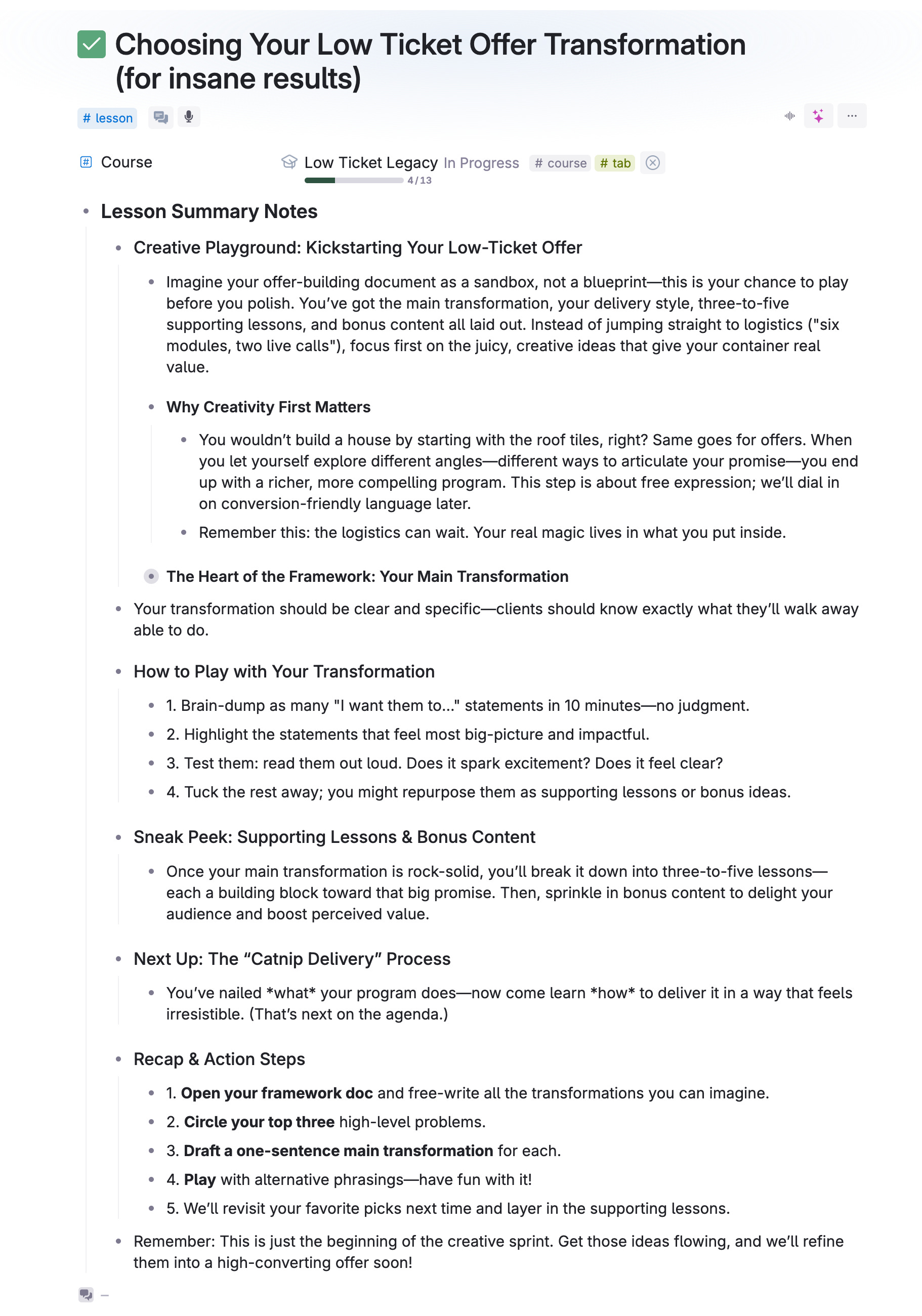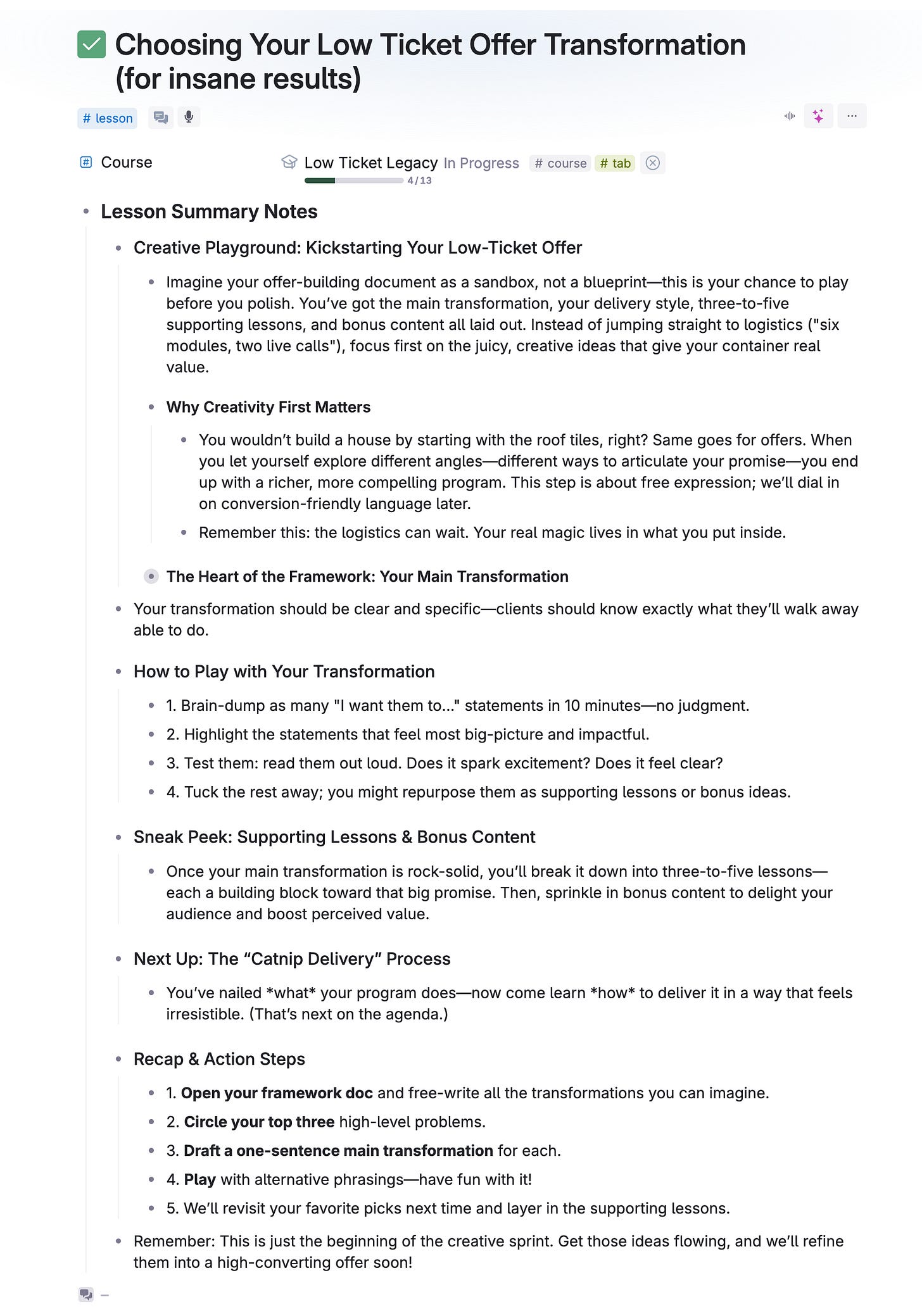 Most of us are familiar with some kind of meeting transcription tool. But you don't have to stop at just meetings. They work just as well transcribing a video you are watching from a course lesson. Which is exactly what I do. While I watch the course lesson, I switch on my meeting note-taker (I suggest something like Tana or Granola or Notion) and it transcribes the course content for me.